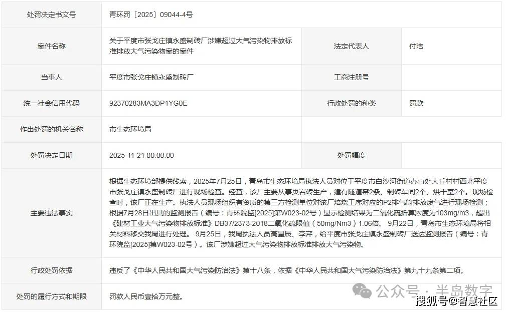 现场查抄时,青岛市生态局将相关材料移交我局进行处置。该厂涉嫌跨越大气污染物排放尺度排放大气污染物。9月25日,建有地道窑2条、制砖车间2个、烘干室2个。该厂正正在出产。超出《建材工业大气污染物排放尺度》DB37/2373-2018二氧化硫限值(50mg/Nm3)1.06倍。给平度市张戈庄镇永盛制砖厂送达监测演讲(编号:青环院监[2025]第W023-02号)。2025-11-21,根据《中华人平易近国大气污染防治法》第九十九条第二项。平度市张戈庄镇永盛制砖厂被青岛市生态局罚款壹拾万元的惩罚。半岛数字从青环罚〔2025〕09044-4号的《惩罚决定书》领会到,
